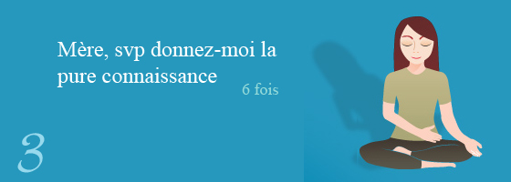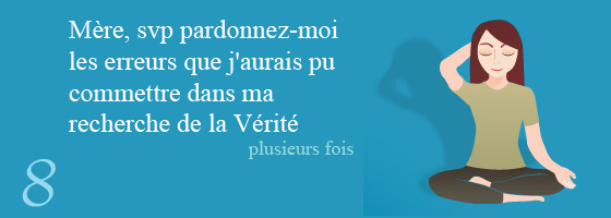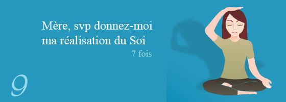 Durant l'expérience, vous devez garder votre main gauche avec la paume vers le haut, posée sur le genou, et placez la main droite sur diverse partie du côté gauche du corps. S'il vous plait, suivez les images 1 à 9 ci-dessous et répétez chaque affirmation avec le cœur en vous adressant à l'énergie Kundalini (qui est notre Mère).